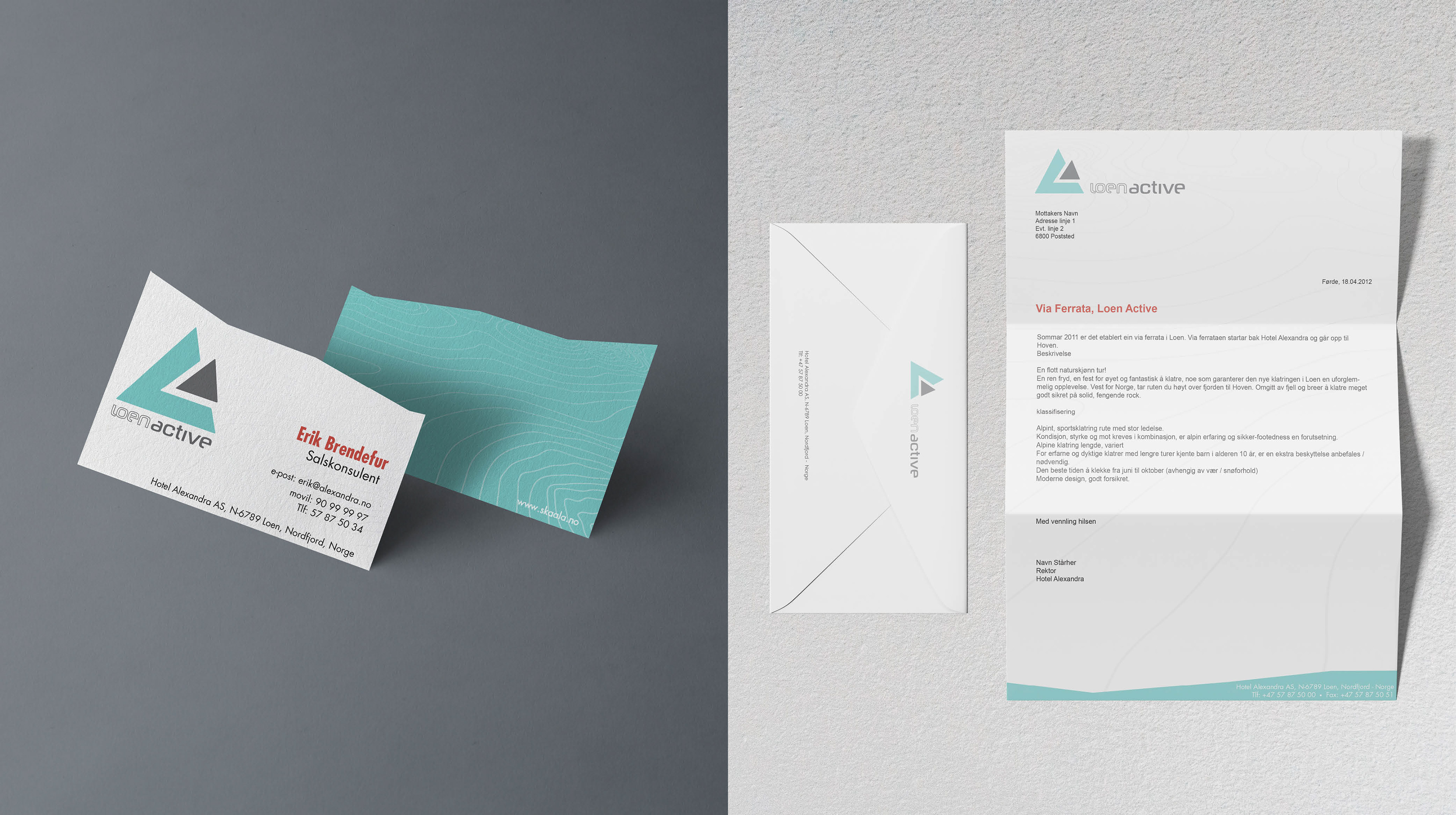 [PROSJEKT] Loen Active sin profil utstråler en naturlig følelse. Naturlige farger er en viktig del av varemerket. Profilen er aktiv og energisk, og alt skjer i naturens omgivelser. Gjennom logoen formidles det at Loen er stedet for et aktivt liv og at de har det beste naturen kan tilby. Logoens design er en forlengelse av fjellene, dalene, den grønne fjorden og elven, og søker å gi en autentisk opplevelse. Den skal raskt etablere Loen Active som en bedrift som driver med aktivitets- og naturbasert turisme i Loen. Fargevalget er basert på elementer i regionen. Det blå representerer den organiske dimensjonen av merket, og det grå assosierer til fjellet. Samtidig er det en moderne og lett typografi som plasserer logoen i sammenheng med løftet om det aktive og dynamiske.
